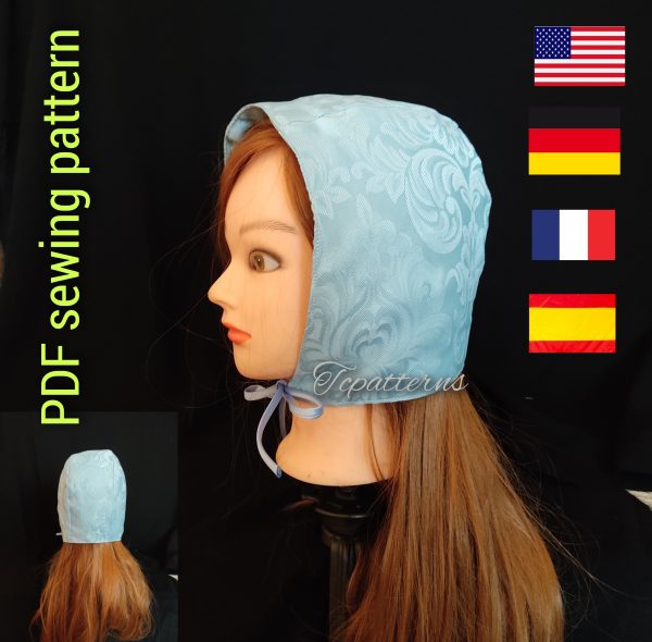 Sewing pattern for a fitted hat, with written instructions and photos in 4 languages