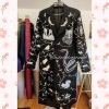 Long black twill coat with numerous white embroideries, featuring a long back vent and button fastening, plus decorative buttons on the cuffs.